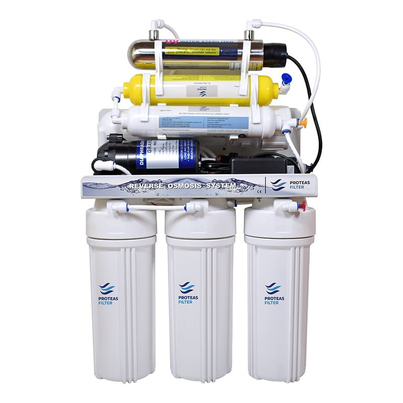 Σύστημα αντίστροφης όσμωσης, 7 σταδίων με αντλία και λάμπα UV, δοχείο διαστολής, βρυσάκι. Διαθέτει 3 πρόφιλτρα (φίλτρο πολυπροπυλενίου 10″ – 1μm, φίλτρο κοκκώδους ενεργού άνθρακα 10″, φίλτρο συμπαγούς ενεργού άνθρακα 10″ – 5μm), μεμβράνη αντίστροφης όσμωσης 75GPD, φίλτρο βελτίωσης γεύσης και οσμής του νερού, φίλτρο προσθήκης των απαραίτητων ιχνοστοιχείων για το ανθρώπινο σώμα και την λάμπα UV.